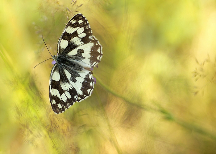 Er hat schwarz-weiß gemusterte Flügel, die an ein Schachbrett erinnern.