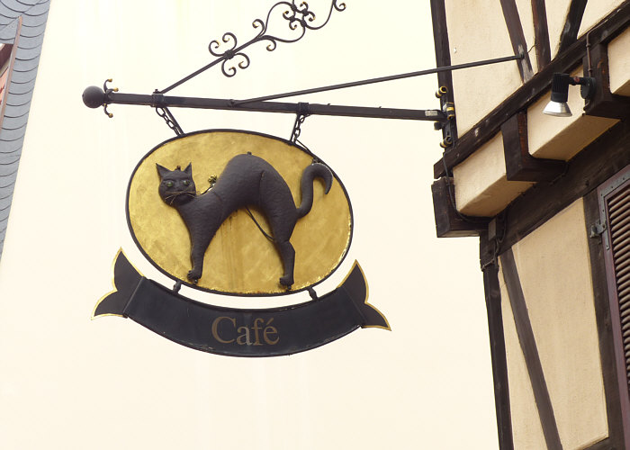 Wir stehen vor dem Café "schwarze Katze" in Neustadt.