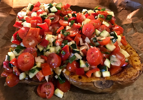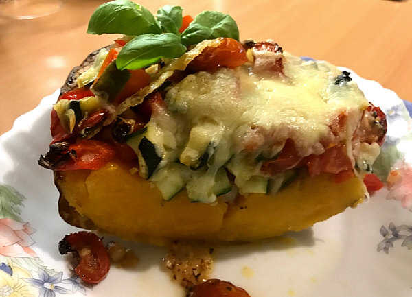 Gemüse in die Kürbishälften geben, Backofentemperatur auf 220 °C (Umluft 200 °C;