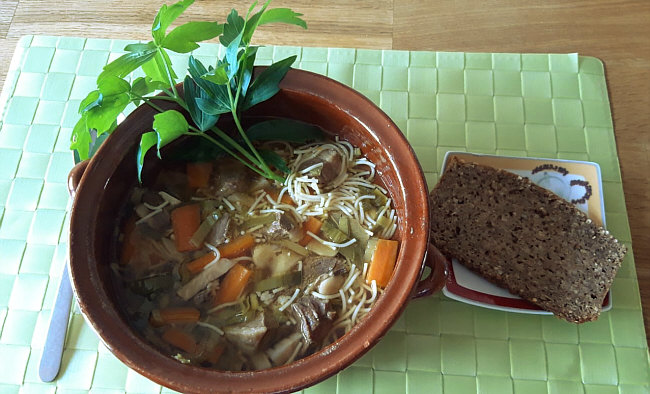 Zusammen mit dem angedünsteten Suppengemüse aufsetzen,