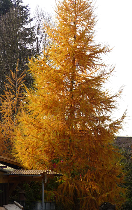 Vorgestern fotografiert ... eine Rose, die noch blüht und im Hintergrund ein Traum von einer Lärche mit Herbstfärbung: [Kommentieren]