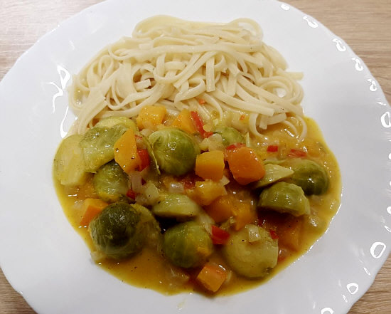Mit Brühe ablöschen und 12 Minuten garen (bzw. so lange bis der Rosenkohl weich