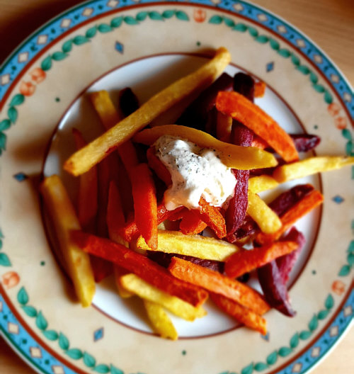Das sind Pommes aus Karotten, Pastinaken und Rote Bete.