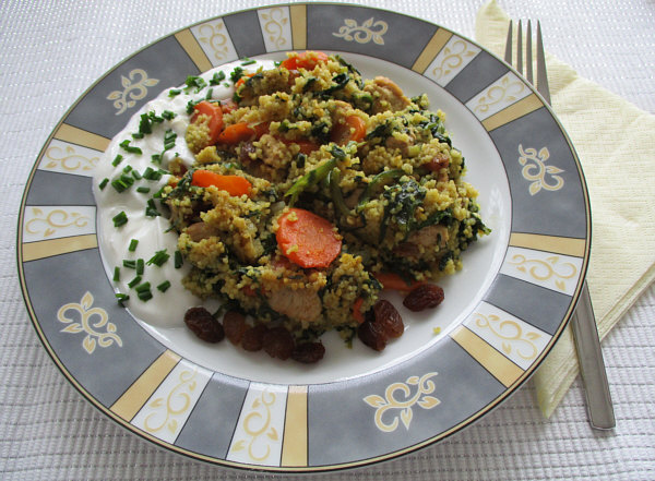 Dann das Hähnchenfleisch und den Couscous unterrühren.