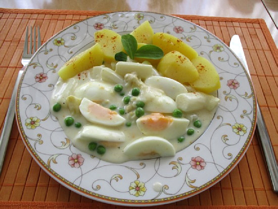 Eier in Viertel schneiden, Soße mit Pfeffer und Muskatnuss würzen.