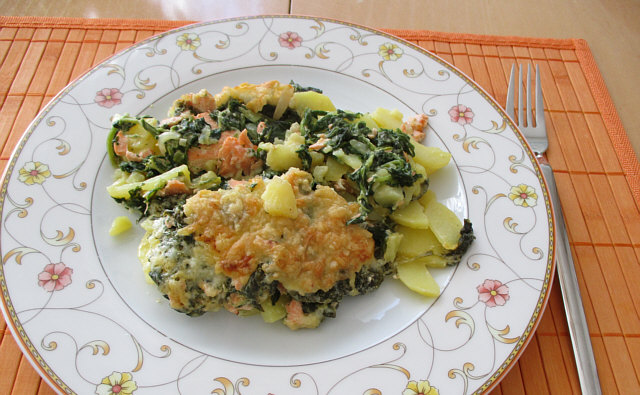 darauf kommt dann die Lachs-Spinatsoße und zum Schluss
