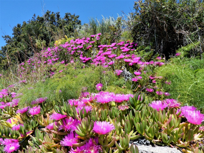ein Hang voll aufgeblühter Mittagsblumen (Delosperma) ...