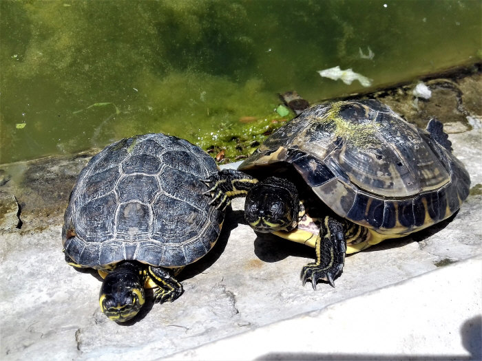 die sich auf dem vermoosten Sockel und im Wasser tummelten.