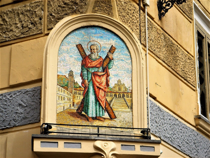 Ein Wandmosaik am Fuß der Kirchentreppe weist auf dieses "Andreaskreuz" hin