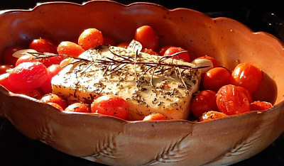 Fetakäse mit Tomaten, Gewürze und Olivenöl ... alles in eine Auflaufform