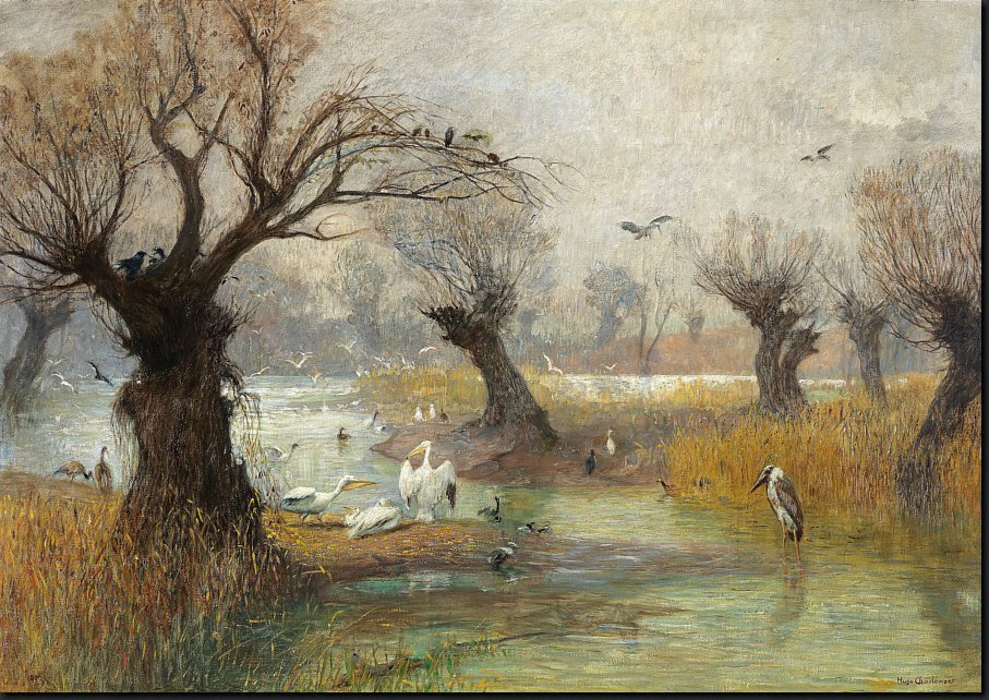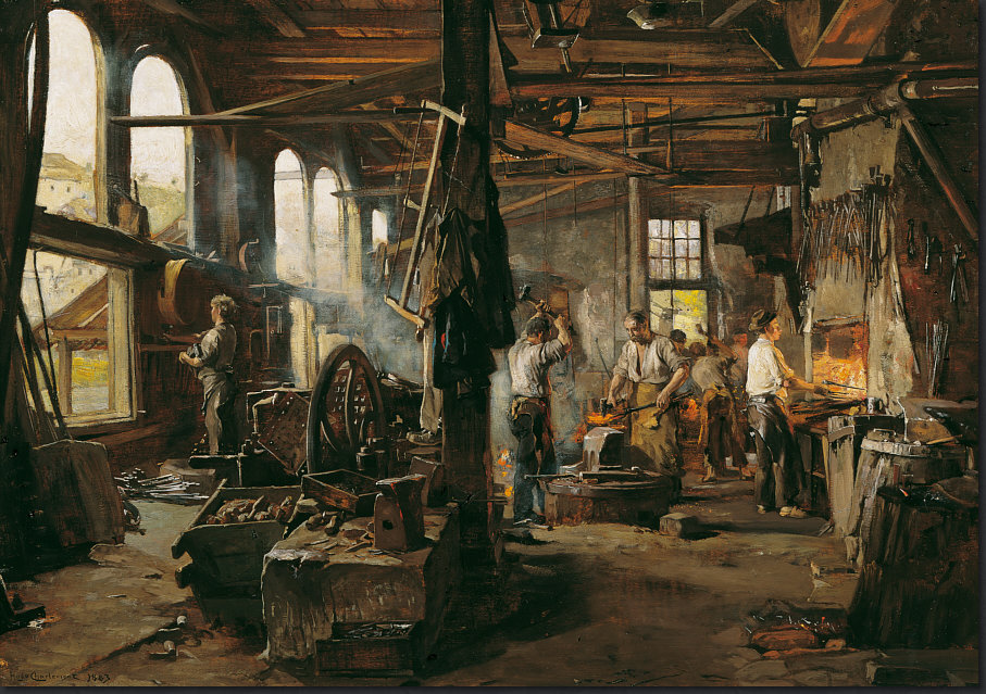 Hugo Charlemont (Österreich) (1850–1939) - oben: "Interieur einer Hammerschmiede" ... unten: "Pelikane am Flussufer" Deine Gedanken zu diesen Bildern ? [Kommentieren]