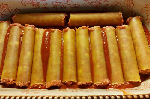 Dann werden die gefüllten Cannelloni in die Form geschichtet.