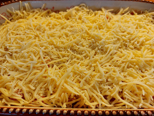 Anschließend den Rest Hack darauf verteilen und den Rest Tomatensoße.