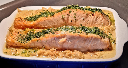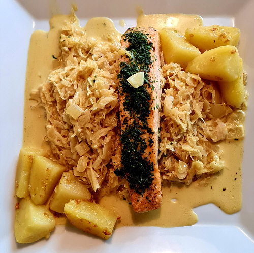 Dann die Lachsfilets auf das Sauerkraut legen, mit den Kräutern bestreuen