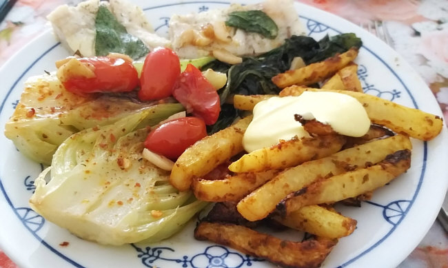 Seelachs, Pak choi mit Knoblauch und Kohlrabipommes aus der Heißluftfriteuse