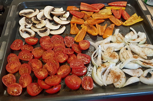 Pilze, weiße Zwiebel, Snackpaprika, Tomaten.
