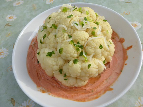und auf einen großen Teller gießen, vorsichtig den Blumenkohl auf den Teller