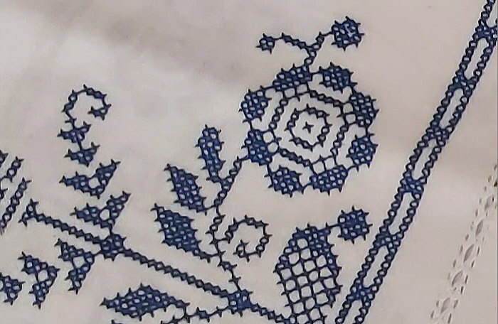 Christine B. zeigt uns ... ... eine Kreuzstichstickerei ... und sagt dazu ... ... dass dieser Kissenbezug und die kleine Mitteldecke aus dem Nachlass ihrer Mama sei. Welche Vorfahrin das gestickt hat, weiß Christine leider nicht. [Kommentieren]