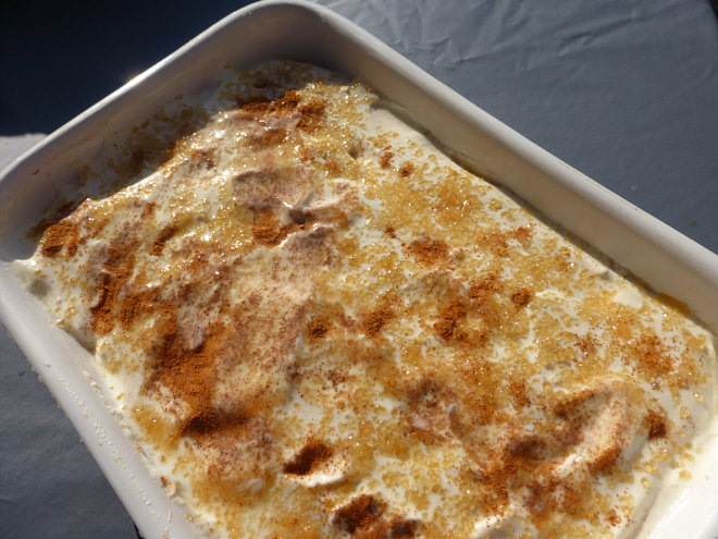 Zum Schluss mit dem Zucker-Zimt-Gemisch bestreuen, kalt stellen.