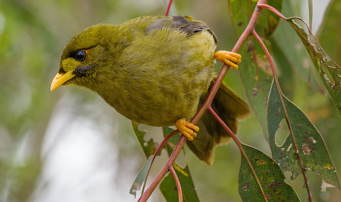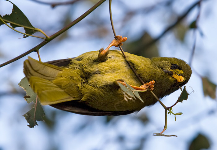 und ihr olivgrünes Gefieder verschmilzt mit den umliegenden Blättern.