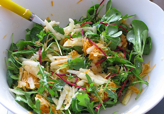 Grüne Salatmischung waschen, Karotten fein reiben, Apfel gröber reiben,