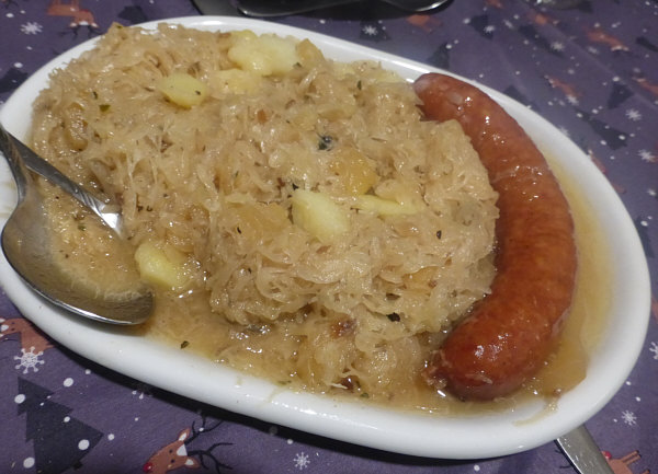 Wenn das Kraut gar ist, Kartoffeln und Wurst zum Sauerkraut geben und alles kurz