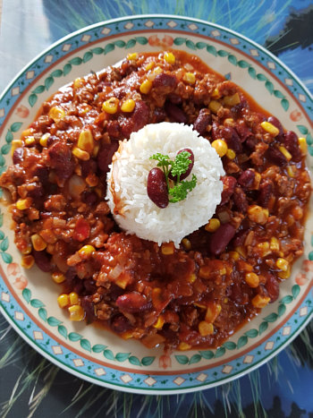 1 kl. Dose Mais, 1 kl. Dose rote Bohnen, 1 Päckchen gehackte Tomaten dazugeben