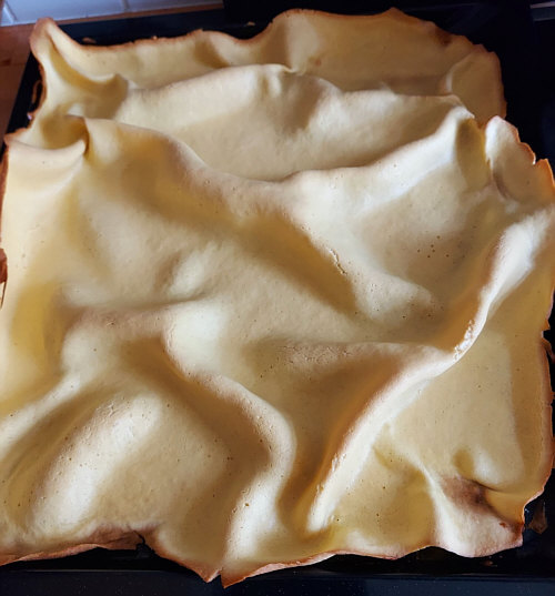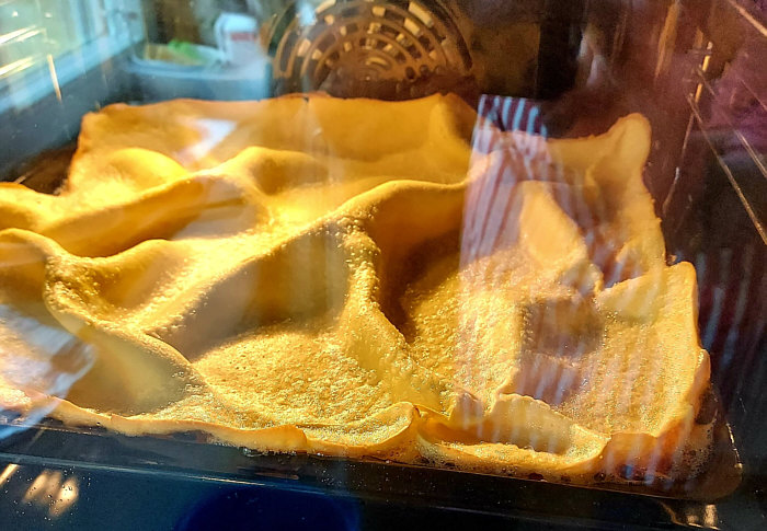 Der Kuchen sollte sich wellen und gelb aussehen, er darf nicht braun werden.