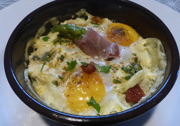 jeweils 2 Eier pro Töpfchen sowie die Kochsahne darüber geben.