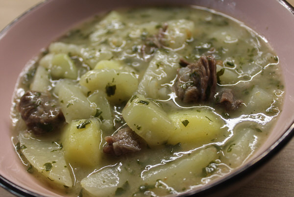 Das Fleisch und die gehackten Blätter in die Brühe geben.