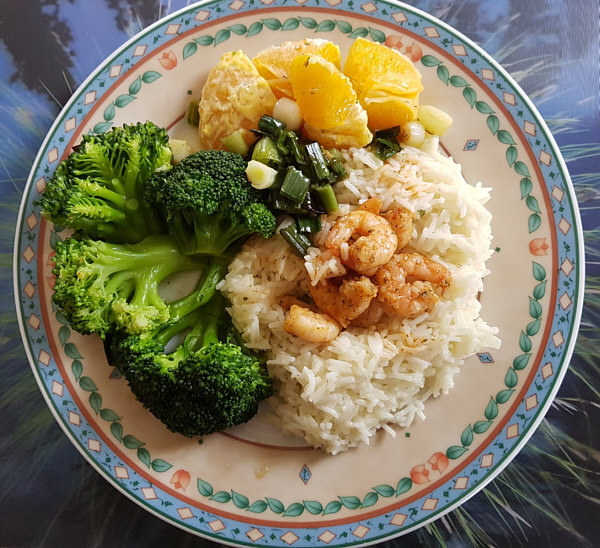 Garnelen mit Brokkoli und Orange, dazu Reis