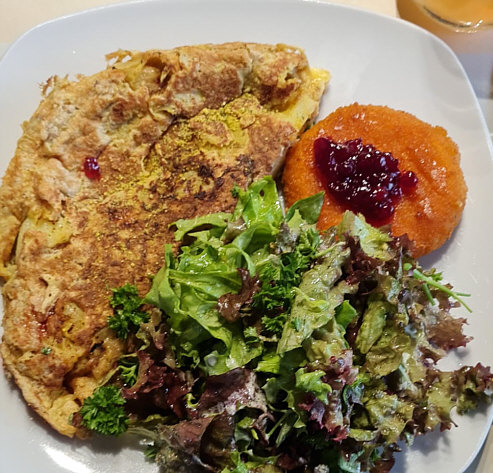 Kartoffel-Eierpfannkuchen eigenem Pflücksalat und Back-Camembert