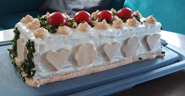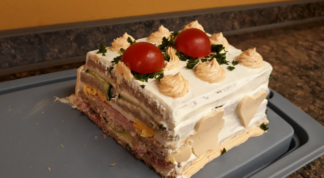 Die unterste Schicht der Brottorte besteht aus Brot.