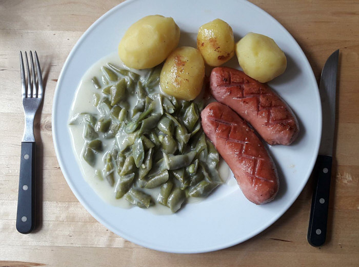 (Rahmbohnen mit Kartoffeln und gebratener Knackwurst)