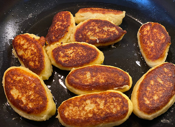 und dann kleine Portionen zu "Nudeln" formen und in Butterfett rausbacken bis
