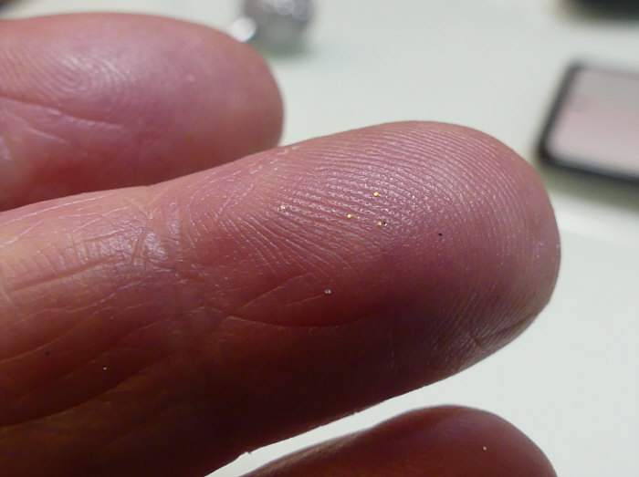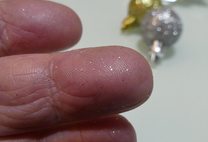 Heute: Glitter auf der Fingerkuppe ... ... als Ergebnis der Weihnachtskugel-Makro-Fotografie ... ... da sehen dann die Finger zum Schluss so aus: