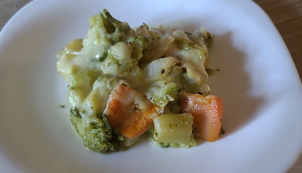 Das Gemüse in eine Auflaufform geben und die Soße darüber verteilen.