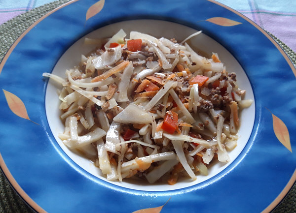 Gewürzt habe ich mit gemahlenem Kümmel, etwas Sojasauce, Pfeffer und Salz.