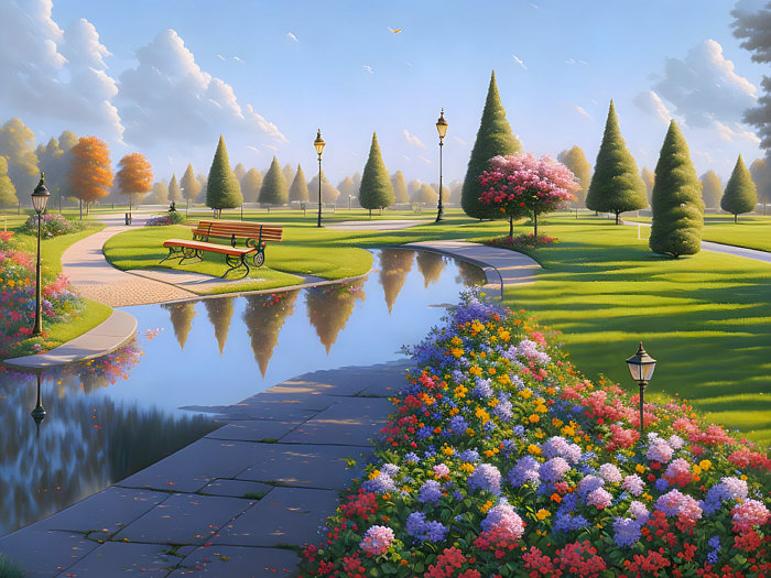 (Ergänzung: Park mit Bäumen, schmale Wege, Bänke, Blumenbeete, sanfte Farben,