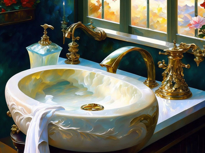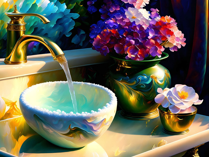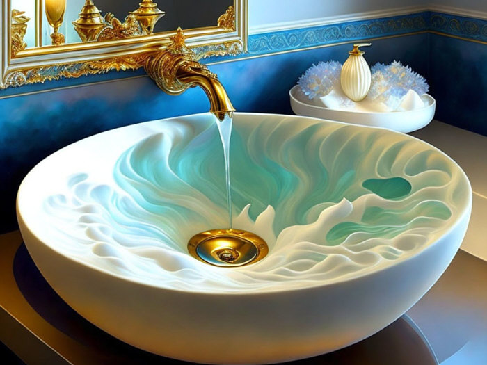 Ich schrieb (übersetzt): Waschbecken mit einer Landschaft mit Seifenblasen.