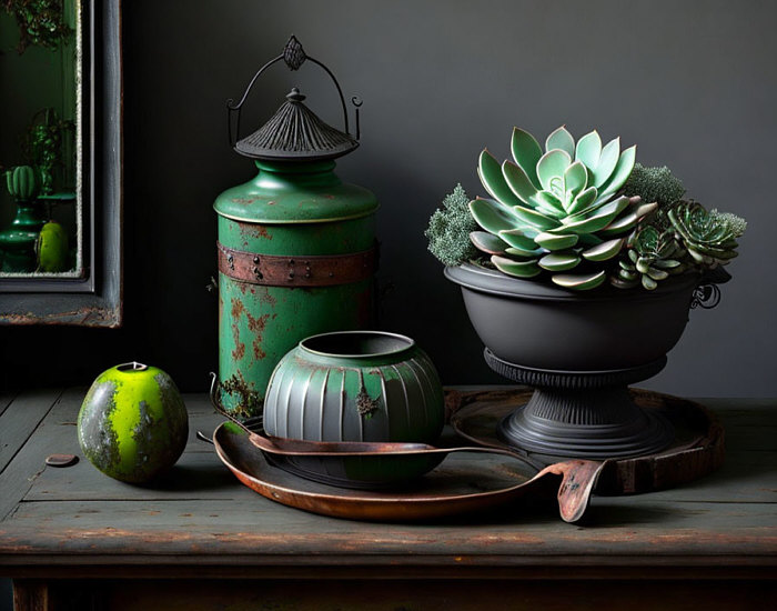 Schön gemaltes Stillleben, staubige Schwarztöne und Grau- und Grüntöne,