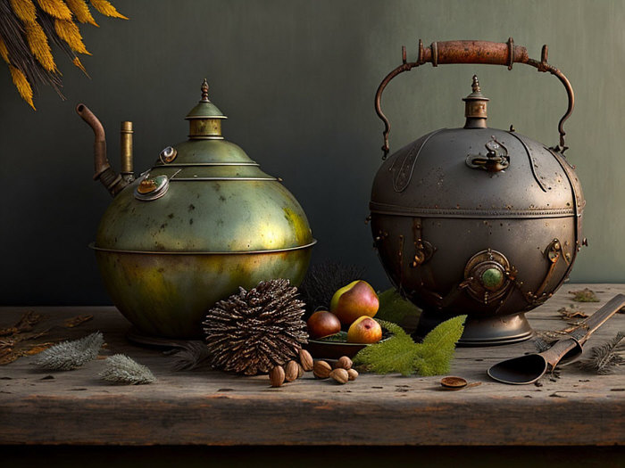 Eisen, Rost und altes Holz, rembrandeske Kontraste, Nüsse, getrocknete Gräser.