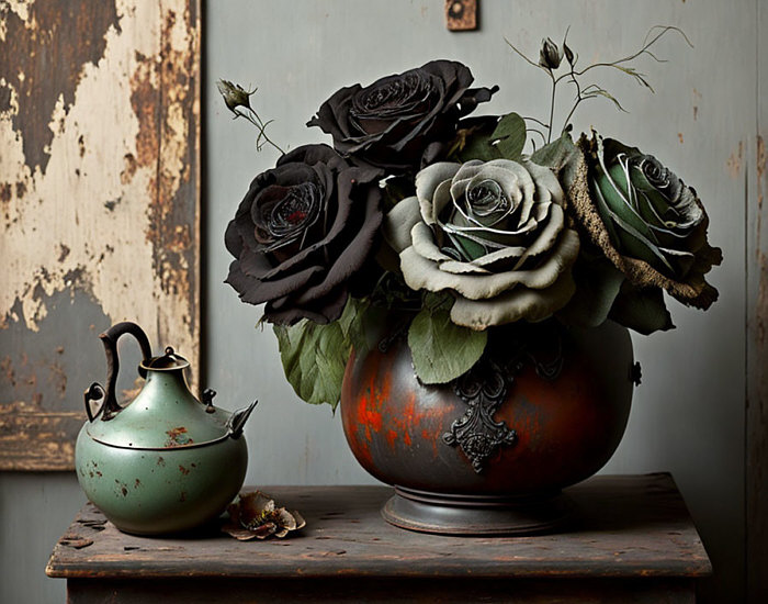 Schön gemaltes Stillleben mit getrockneten Rosen, staubigen Schwarztönen