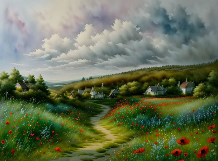 in der Ferne viele Mohnblumen und sanfte Wildblumen,