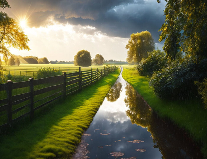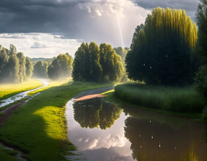 through the dark clouds shines the sun, it is reflected in the rain puddles,