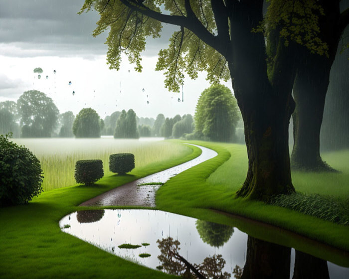 Regenpfützen auf einem kleinen Weg, der ins Grüne führt,