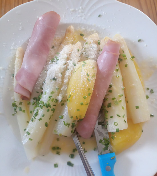 Spargel mit Kartoffeln, Kochschinken und Parmesankäse