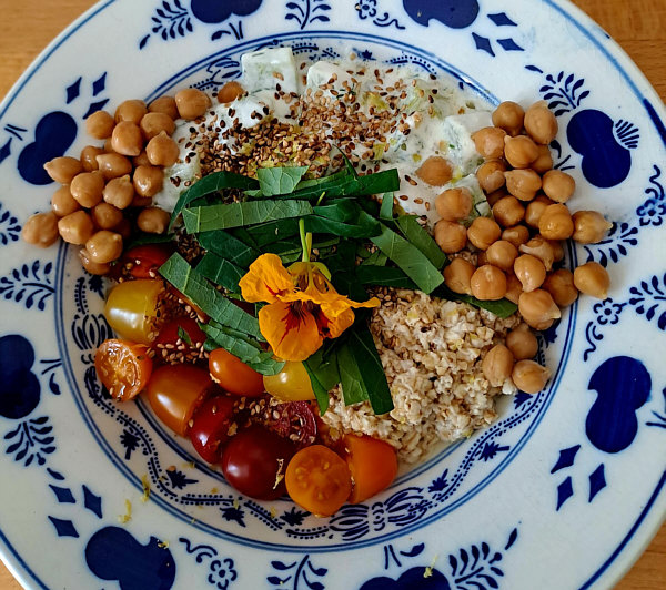 Bowl mit Gurke, Tomate, Kichererbsen und Haferflocken.
