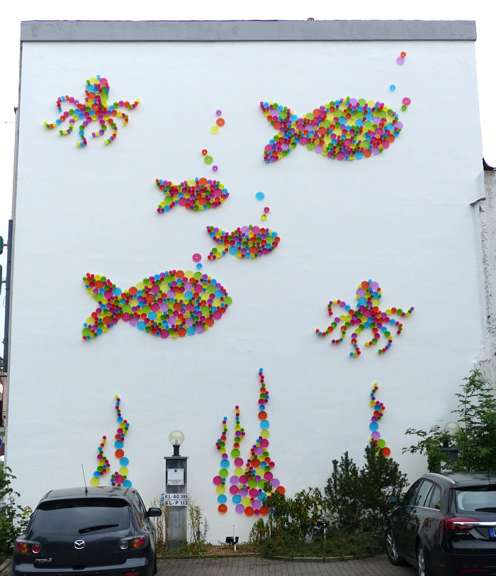 Das fängt ja ganz schön seelenfarbig an :). Diese Plastik-Becher und -teller sind Teil eines ... ... großen Fisches und dieser ist Teil ... ... einer ganzen Unterwasserlandschaft an einer Hauswand. [Kommentieren]