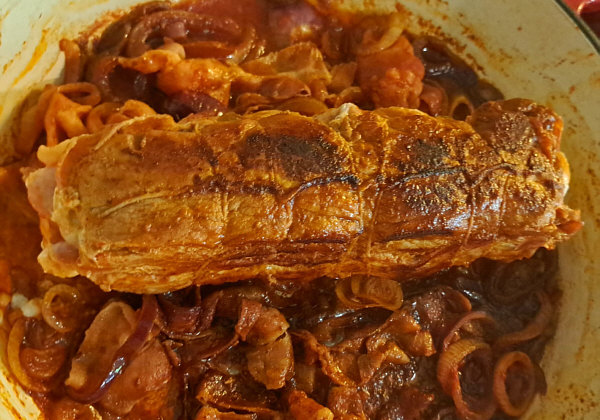 Zwiebel-Paprika-Gemüse, Petersilienkartoffeln, Salat - Schoko-Roulade